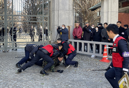 警視庁本富士署は14日、大学入学共通テストの試験会場となる東京大学の正門前で、無差別殺傷を想定した訓練を行った。神永信哉署長は、「受験生が安心して試験に臨めるよう警戒を強化する」と力を込めた。 【時事通信社】