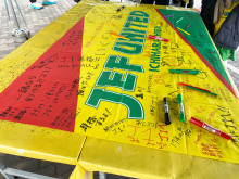 試合後サポータの前であいさつした米倉恒貴選手は千葉市出身。ジェフ千葉がJ1に在籍していた2009年のチームを知る最年長選手。「ありがとうございます。最高の『俺たちジェフ』をやります」と呼びかけた。米倉選手が「俺たち」と叫び、サポーターが「ジェフ」と応えたが、通常3回で終わるコールを6回繰り返すと、笑い声と歓声が重なった「ジェフ」になった。