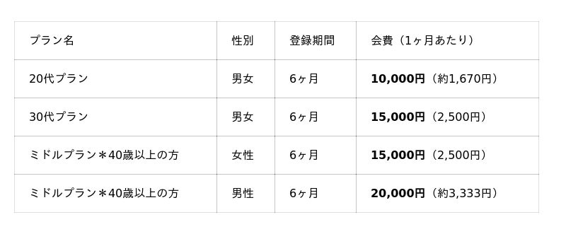 入会金や成婚料は不要。年代別の料金設定で、費用を抑えながら無理なく婚活を始められます。
