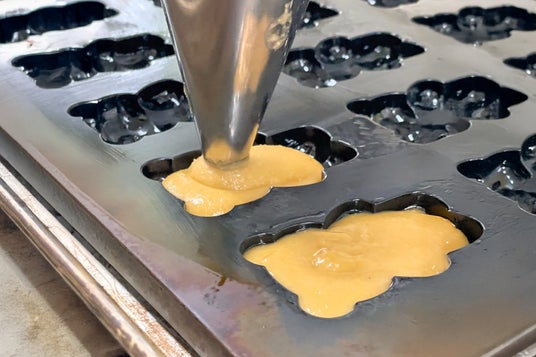 このメープルと焦がしバターの香りが溶け合った、まさに「黄金色の誘惑」とも言える生地を、愛らしいくま型の特注モールドへ、一つひとつ丁寧に絞り出していきます。ぷっくりとしたくまのフォルムを忠実に再現するため、生地の量と絞り方に職人の繊細な技術が光ります。