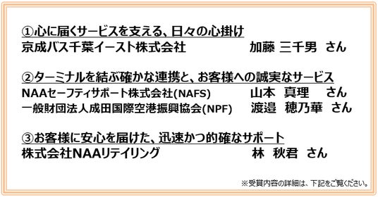 素晴らしいサービス事例を成田空港内に広め、空港スタッフのサービスレベルとモチベーションの向上を目的に、成田空港CS協議会が主催するお客様の期待を超えるサービスをしたスタッフを表彰する制度です。