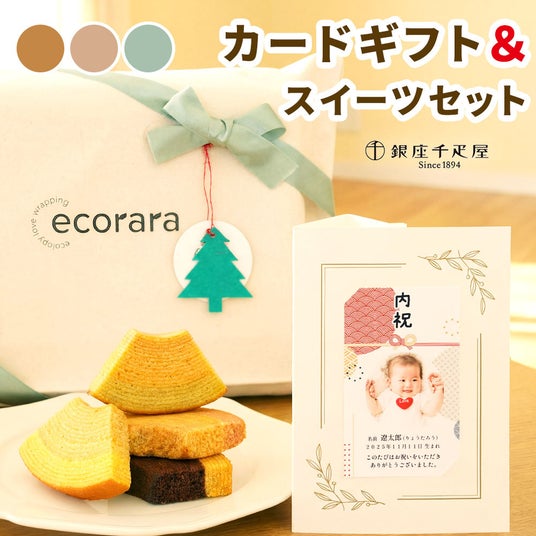 「エコララ」シリーズは、「エコラララッピング」+「赤ちゃん名刺ギフト」 を共通仕様とし、その上で中身のギフトを変えたセット商品を展開しています。
