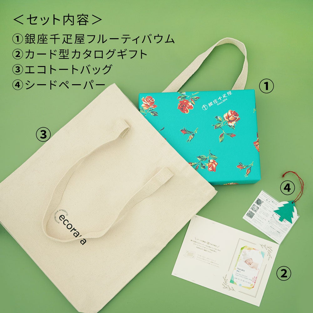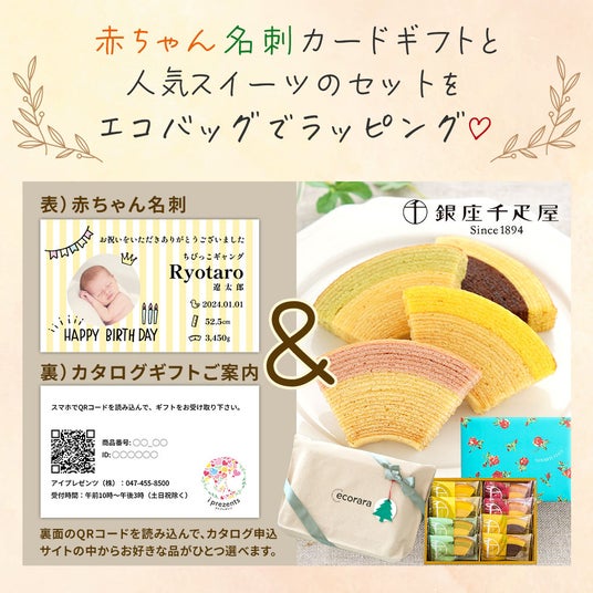 人気の千疋屋バウムクーヘンと当社オリジナル商品「赤ちゃん名刺ギフト」を組み合わせ、
