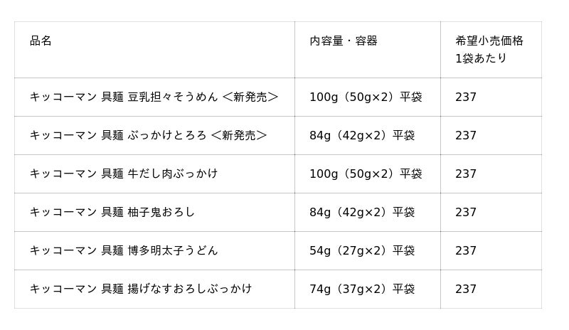「具麺」シリーズは、このたび新発売する「豆乳担々そうめん」「ぶっかけとろろ」を含め、合計6アイテムとなります。キッコーマンはこれからもお客様のニーズに合わせ、毎日の食事づくりを応援してまいります。