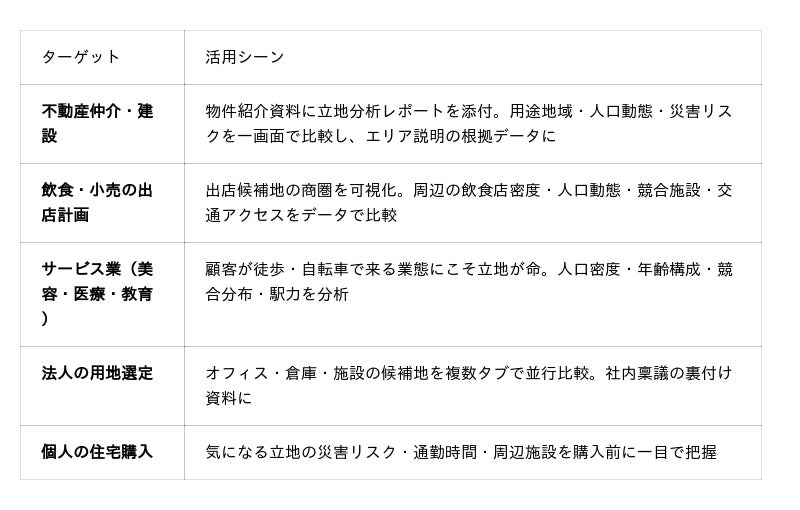 首都圏(東京都・神奈川県・千葉県・埼玉県)を対象に、165万点以上の施設データと137のGIS図層をブラウザ上で即座に可視化。任意の地点に対して51項目の立地指標を100ミリ秒以下で算出し、不動産仲介の物件紹介資料、飲食・小売の出店分析、法人の用地選定に、データに基づく意思決定の基盤を提供します。