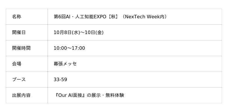 JetB株式会社(本社:東京都新宿区、代表取締役:竹内勇人、以下「JetB」)は、このたび2025年10月8日(水)から10日(金)まで幕張メッセで開催される『第6回 AI・人工知能EXPO【秋】』にて、アバター型AI面接ツール『Our AI面接』を初出展することをお知らせいたします。