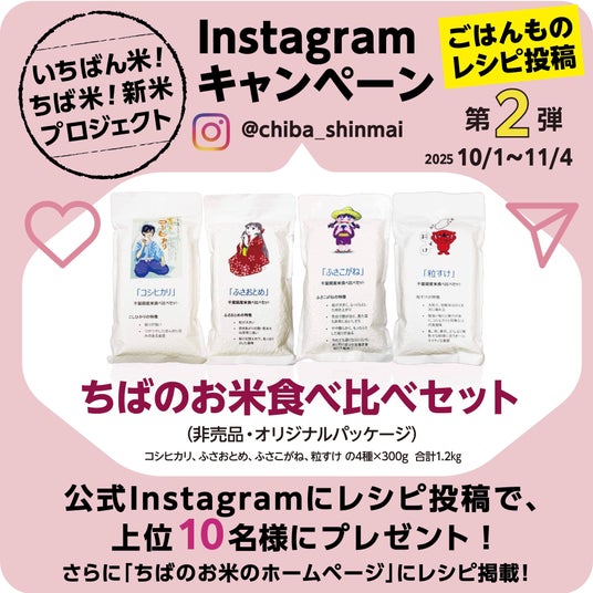 千葉県や米関連団体などで構成し、県民等への千葉県産米の消費拡大を図ること等を目的に活動する「千葉県産米需要拡大推進協議会(代表者:松元 善一)/事務局:千葉県農林水産部生産振興課(千葉県千葉市中央区市場町1-1)/キャンペーン運営事務局:株式会社オニオン新聞社(千葉県千葉市中央区中央3-3-1)」では、おいしい千葉の新米を広くPRするため、2025年11月4日(火)までの応募期間限定で、上位10名の方に「ちばのお米食べ比べセット(非売品)」をプレゼントするInstagramごはんものレシピ投稿キャンペーンを実施中です。