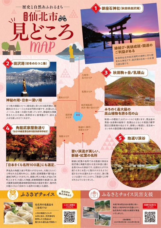 秋田県仙北市は、秋田県の東部中央に位置し、岩手県と隣接しています。 ほぼ中央に水深が日本一の田沢湖があり、東に秋田駒ヶ岳、北に八幡平、南は仙北平野に広がっています。 地域の約8割が森林地帯で、農林業と観光業が盛んで、歴史的な武家屋敷や温泉地も魅力的です。また、田沢湖周辺では多くの小正月行事やグリーンツーリズムが行われており、自然と文化が融合した地域です。