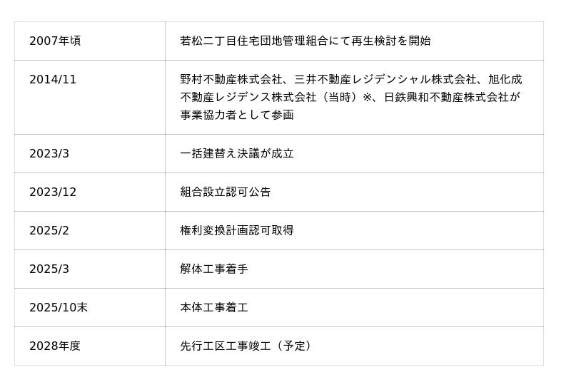 若松二丁目住宅マンション建替組合(理事長:新藤昭典、コンサルタント:株式会社 NEXT ARCHITECT&ASSOCIATES)と、本組合に参加組合員として参画している野村不動産株式会社(本社:東京都港区/代表取締役社長:松尾大作)、三井不動産レジデンシャル株式会社(本社:東京都中央区/代表取締役 社長:嘉村徹)、旭化成ホームズ株式会社(本社:東京都千代田区/代表取締役社長:大和久裕二)、日鉄興和不動産株式会社(本社:東京都港区/代表取締役社長:三輪正浩)は、本組合が施行する「若松二丁目住宅マンション建替え事業」(以下、本事業)において、2025年10月31日に着工しましたことをお知らせいたします。
