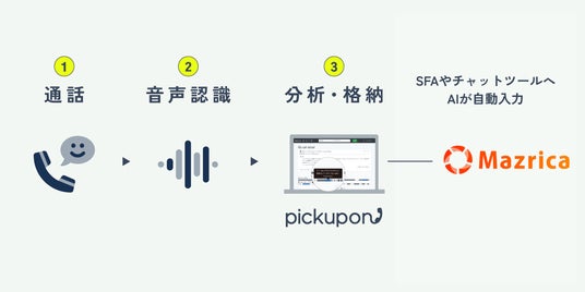 株式会社マツリカ(東京都中央区、代表取締役CEO:黒佐英司)が提供する営業支援プラットフォーム「Mazrica Sales」と、pickupon株式会社(千葉県市川市、代表:小幡洋一、以下pickupon)が提供する会話サマリーAI電話「pickupon(ピクポン)」は、このたび新たに機能連携しました。