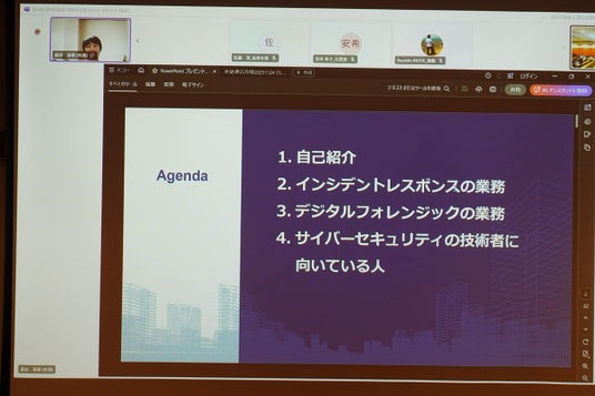 後半では、株式会社ラック コンサルティング統括部 CECIDフォレンジックサービスGの前田恭耶氏(高知高専卒)が登壇し、現場での業務内容を紹介しました。前田氏は、インシデントレスポンスやデジタルフォレンジック業務を担当し、サイバー攻撃の初動対応、証拠保全、調査解析などを行っています。「興味・関心・適性を軸にキャリアを選び、積極的に挑戦してください」と学生にメッセージを送りました。