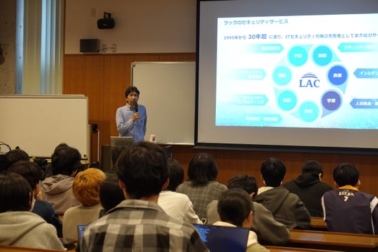 講義の前半では、株式会社ラック サイバー・グリッド・ジャパン 主席研究員の長谷川長一氏が登壇し、同社が取り組む産学官連携や国際的な活動について詳しく説明しました。同社は、日本サイバー犯罪対策センター(JC3)に2017年から参画し、警察庁と連携してサイバー犯罪対策を推進しています。また、国際警察機構インターポールのデジタル犯罪対策センター(シンガポール)にも2015年から協力し、監視システムのエンジン提供などを行っています。さらに、Microsoftとの共同リリースによる海外詐欺組織摘発など、国際的な取り組みも進めています。
