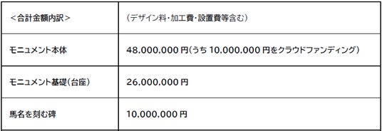 今回、皆様からお寄せいただきましたご寄付は、「うまのふるさと」の象徴となるモニュメント本体制作・設立のための費用(概算)48,000,000円のうちの一部(10,000,000円)として使わせていただきます。