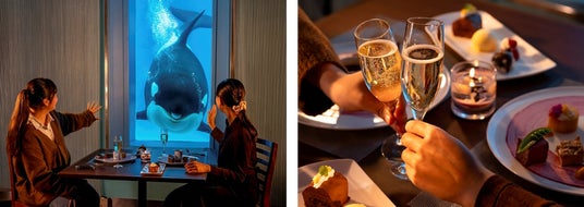 体験後はシャチを見ながら食事ができるレストラン「オーシャン」の観覧窓前でフルコースのクリスマスディナーが始まります。シェフがこの日の為に考案したメニューを一皿ずつお楽しみください。食事中は飼育員がシャチを連れて各観覧窓の前へと訪れる時間も設定しており、思い出に残る素敵なディナータイムになるでしょう。