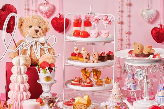 ロゼワインがほのかに香る苺のジュレとミルクパンナコッタのグラスデザートをはじめ、まるで本物のいちごに見立てたムース、くまの形に仕上げた爽やかなベルガモットの風味が広がるくまマカロン、思わず写真に撮りたくなる、パステルピンクのグラデーションが可愛いハートのメレンゲポップ、ちょこんと座った姿が愛らしいサクサク食感のくま型クランチチョコ、アイコニックなくまチョコレートが乗ったいちごとアールグレイのタルト、濃厚なカカオがとろけ出す大人仕立てのチョコレートメルトケーキなどのくまさんモチーフを取り入れたパティシエこだわりのスイーツ7種をご用意。