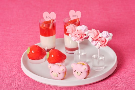 苺とロゼワインのジュレ ミルクパンナコッタ/ハートのメレンゲポップ/ベルガモット香るクママカロン/苺のムース/クマ型クランチチョコ/苺とアールグレイのタルト/チョコレートメルトケーキ