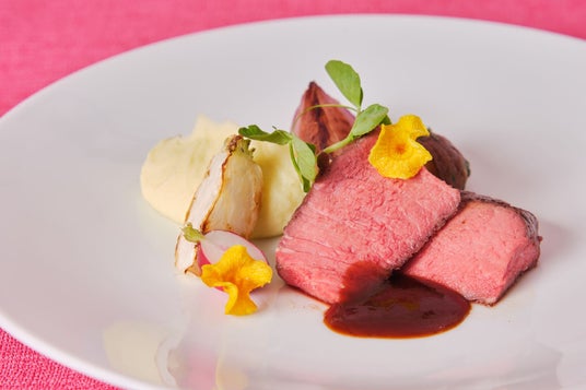 蕪のポタージュ/牛ランプステーキ シャリアピンソース 燻製ブラックペッパーの香り