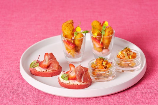 生ハムと苺のクロスティーニ/スパイシーチキンスティック 苺とヨーグルトのディップ/タスマニアサーモンとディルピクルスのメリメロ