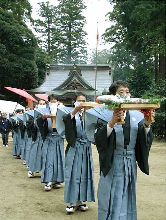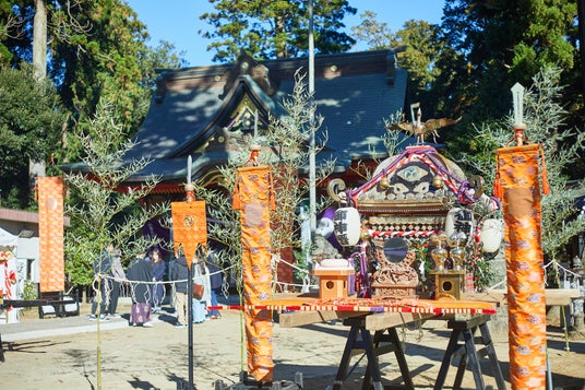 山倉大神の例大祭は、昔、栗山川で捕まえた鮭を奉納したのが始まりとも伝えられています。鮭は「おしゃけさま」と崇められ、塩漬けにした鮭を護符に加工して参拝者に頒布するのが特徴。さらに神輿が地区内を巡り、鮭の護符は「災いをサケる」として珍重され、風邪薬としても使われています。