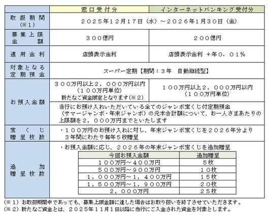 さらに、ご満足いただけるよう2026年の年末ジャンボ宝くじをお預入金額に応じて追加贈呈いたします。