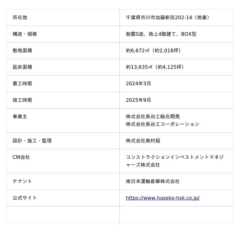 株式会社長谷工総合開発 (本社:東京都港区芝、代表取締役社長:宮原 昭、以下「長谷工総合開発」)と株式会社長谷工コーポレーション(本社:東京都港区芝、代表取締役社長:熊野 聡、以下「長谷工コーポレーション」)は、「市川市加藤新田冷凍冷蔵倉庫プロジェクト」(以下「本プロジェクト」)を竣工しましたことをお知らせいたします。