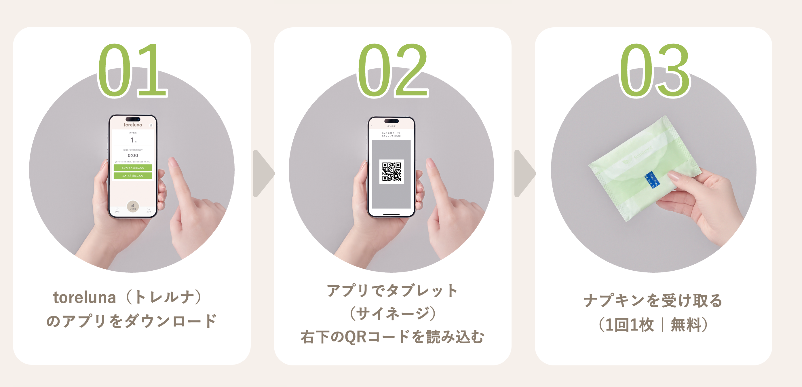 トイレットペーパーと同様に、生理用ナプキンについてもさまざまな施設で無償提供できるようにしたい。そんな想いから本サービスは生まれました。トレルナは、スマートフォンアプリとトイレ内のディスペンサーが連動することで、ナプキンが無料で受け取れるサービスです。トレルナが設置されているトイレ個室に入るとデジタルサイネージにトレルナパートナーの動画が表示され、持続的にサービスを提供できる仕組みとなっています。