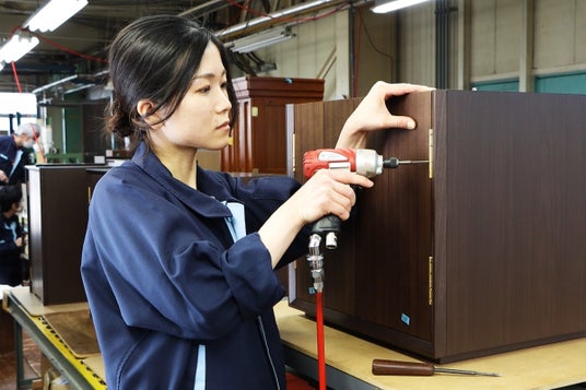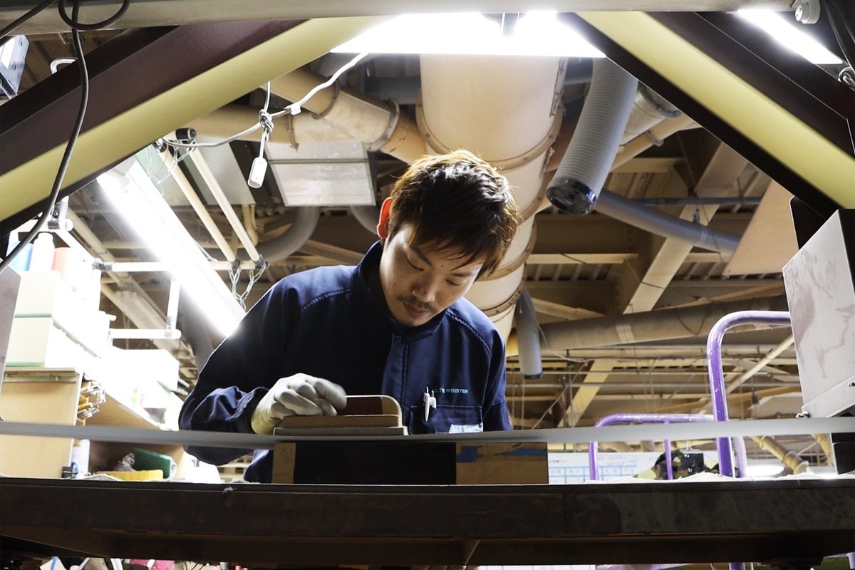 モダン仏壇の製造を担当する女性の職人。精度の高い技術を持つ職人の一人。
