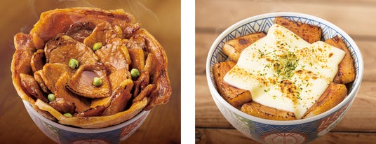 (左)豚ロース丼〈メガ〉/(右)炙りチーズ豚バラ丼〈並〉
