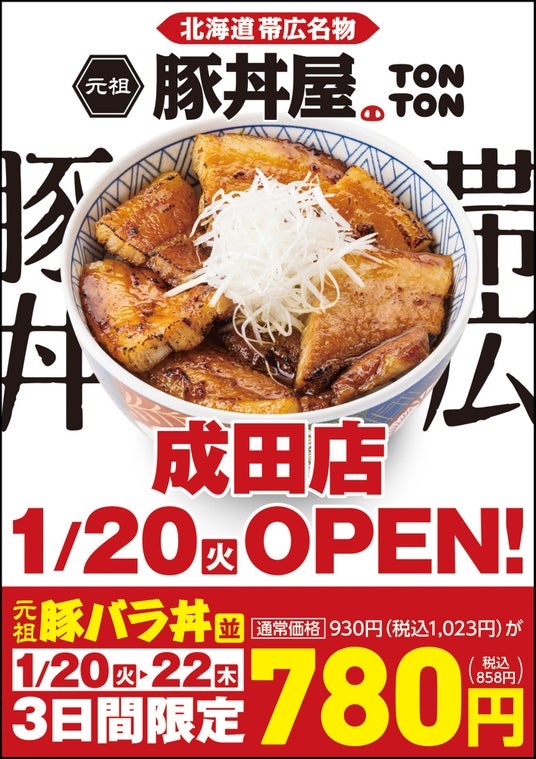ワンズトライン株式会社(本社:大阪市北区芝田2丁目3番16号、代表取締役:山内仁)は、千葉県成田市にオープンする「元祖豚丼屋TONTON 成田店」(住所:千葉県成田市花崎町814-5、TEL:0476-37-4018)のオープン日を、'26年1月20日(火)に決定いたしました。