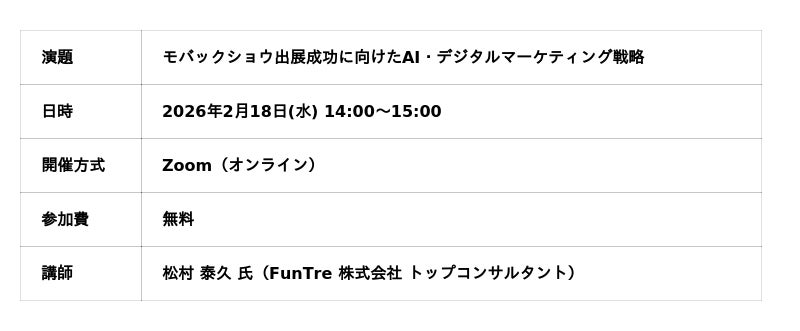 協同組合 日本製パン製菓機械工業会(東京都中央区)は、2027年3月に幕張メッセで開催する「2027モバックショウ(第30回国際製パン製菓関連産業展)」に先駆け、出品予定者を対象とした特別講演会「モバックショウ出展成功に向けたAI・デジタルマーケティング戦略」を、2026年2月18日(水)にオンライン形式で開催いたします。