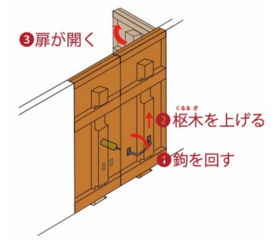 「海老錠」は右側から挿す鍵で、バネをすぼめながら押し出すことで開錠します。また、「クルル鉤」は長い鉄の棒をL 字に曲げて先端をフック状にしたもので、扉を床に固定している縦棒(枢木)に先端を引っ掛けて縦棒を上げることで扉を開けることができました。