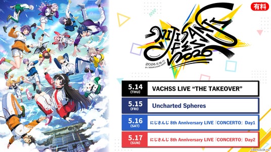 ニコニコ生放送では、人気男性ライバーが集結する「VACHSS LIVE “THE TAKEOVER”」、実力派揃いの「Uncharted Spheres」、グループ8周年を祝う「にじさんじ 8th Anniversary LIVE 『CONCERTO』」(Day1・Day2)のスペシャルステージ4公演を国内独占で生配信します。