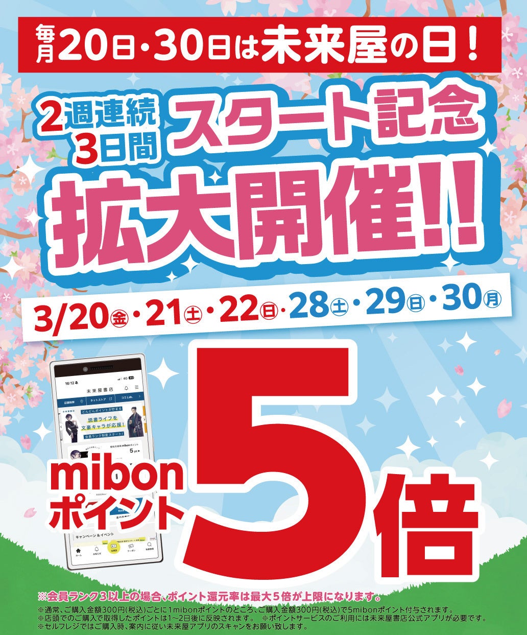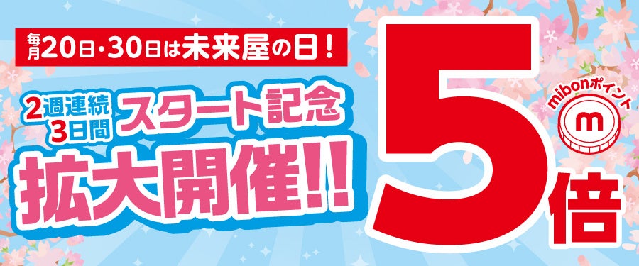 株式会社未来屋書店(本社:千葉県千葉市美浜区、代表取締役社長:平川雅隆、以下 未来屋書店)は、2026 年3 月より、毎月 20 日・30 日を「未来屋の日」と制定いたしました。未来屋書店公式アプリ(以下 アプリ)会員のお 客さまを対象に mibon ポイント5倍サービスを開始いたします。 開始月となる 2026 年3月は、20 日・30 日が週末にあたることから、スタート記念として対象日を拡大し、2週 連続・計6日間のキャンペーンとして実施いたします。